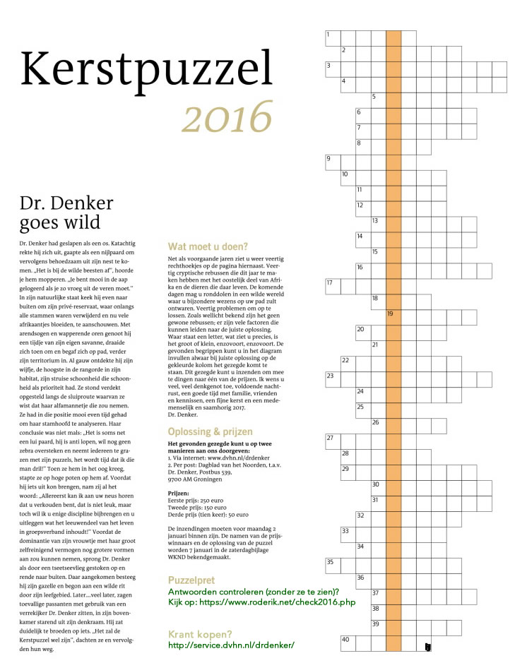 De Dr Denker kerstpuzzel 2016 uit de kerstbijlage van het Dagblad van het Noorden is er weer. Het thema van de Dr Denker 2015 is Dr Denker goes wild, in de puzzel zitten dan ook vermoedelijk 40 begrippen die te maken hebben met het oostelijk deel van Afrika en de dieren die daar leven.
