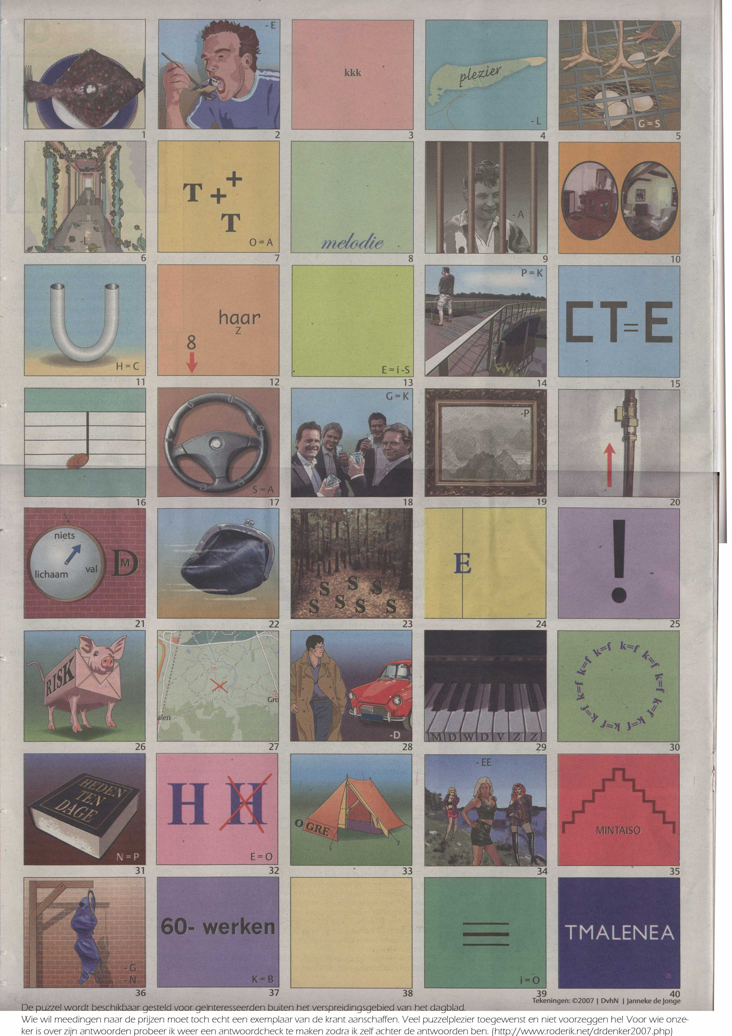 De antwoorden zal ik hier niet plaatsen voor de uiterste inzenddatum. Het is de bedoeling dat u de puzzel zelf maakt. Komt u er echt niet uit, dan kunt u mij na de uiterste inzenddatum wel vragen om een tip of evt. het antwoord (deze zal het dagblad zelf ook publiceren).